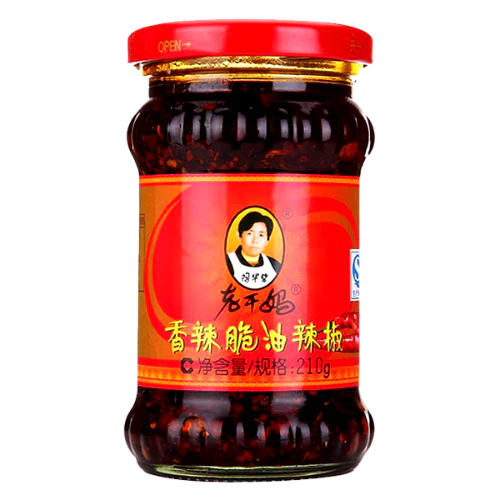 老乾媽香辣脆油辣椒 採用貴州特產辣椒,搭配精選洋蔥、豆豉及花椒,經傳統工藝慢火烘焙而成。不同於一般辣椒油,它含有豐富的香脆辣椒碎與脆洋蔥,每一口都帶有令人上癮的酥脆口感與濃郁油香。