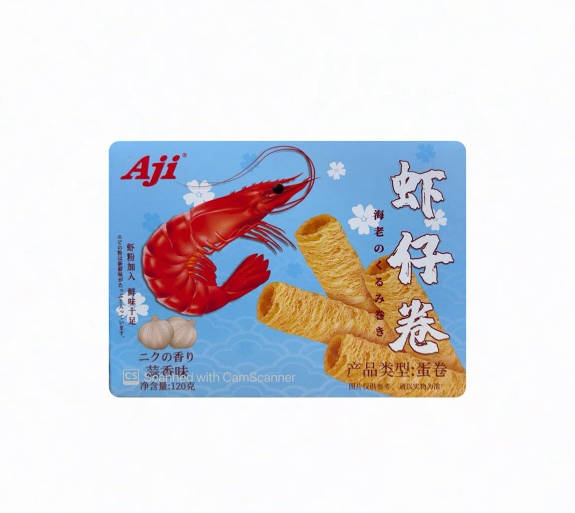 Aji 蝦仔蛋卷選用蝦粉加入蛋卷配方,結合蒜香風味,香而不膩。蛋卷層次分明、入口酥脆,每一口都有淡淡蝦香同蒜香,係受歡迎嘅休閒零食選擇,無論下午茶、追劇或者送禮都非常合適。