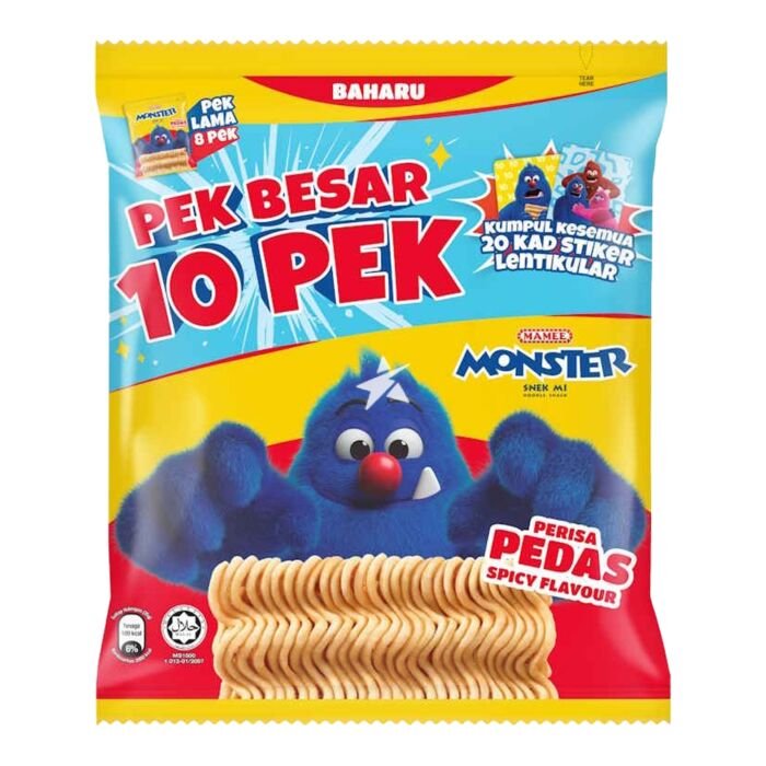來自馬來西亞的國民級零食 Mamee Monster 媽咪麵 經典回歸!這款 10包大包裝(Pek Besar) 是家庭聚會與辦公室分享的最佳選擇。經典的藍色怪獸包裝,承載著無數人的童年回憶,配上令人垂涎的香辣風味,絕對讓您一試成癮!